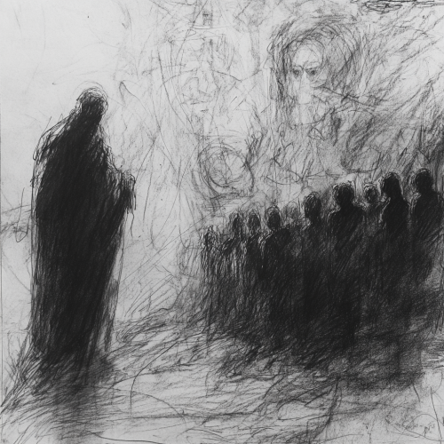 A rough, chaotic pencil sketch with unsettling, mysterious, spiritual, chaotic pencil lines, depicting a scene where a menacing, shadowy figure looms over a group of silent, passive figures. The shadowy figure represents cruelty and oppression, while the silent figures symbolize the tragic inaction of good people. The lines are jagged and abstract, creating a sense of tension and unease. The background is filled with swirling, dark patterns that highlight the contrast between the oppressor and the silent witnesses, emphasizing the weight of their inaction. The overall image is intentionally rough and sketch-like, capturing the profound and unsettling tragedy of silence in the face of evil. --c 8 --v 6.1