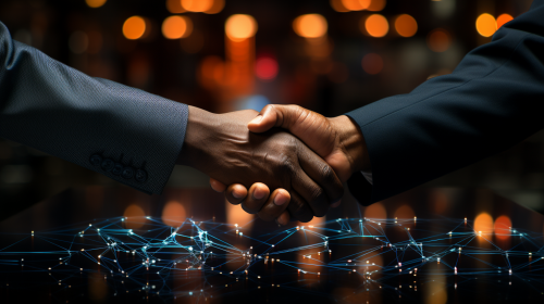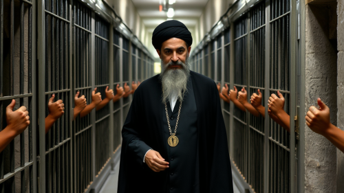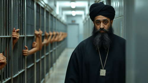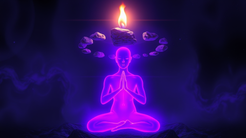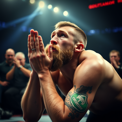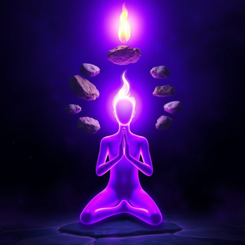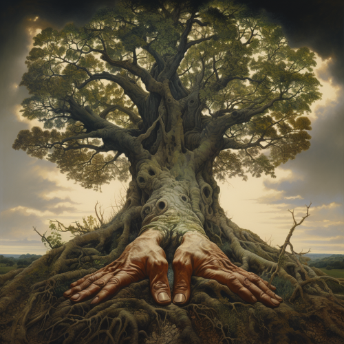 a large oak tree stretches high up to the clouds;the trunk of the oak tree looks like two hands clasped in prayer; the hands have large roots growingdeep into the soil; the imageis dramatic andimpactful