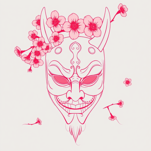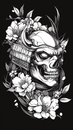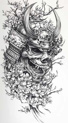 Tattoo design of outline of samurai hannya mask with skull, very detailed line work, side profile, dark shading, cherry blossom flowers in background --ar 9:16