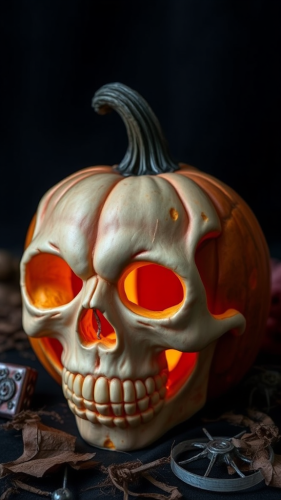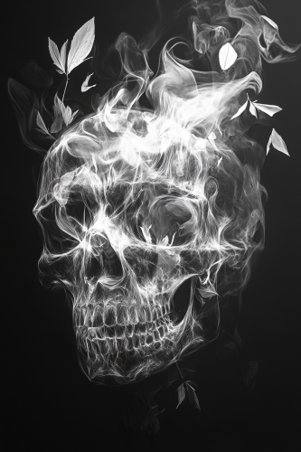 A black and white digital drawing of an ethereal skull made out of smoke, with a dark background. The top half is engulfed in flames, while the bottom half has small leaves swirling around it. The artwork is hyper-realistic, with high contrast and volumetric lighting, resulting in glowing highlights. --ar 2:3 --v 6.1