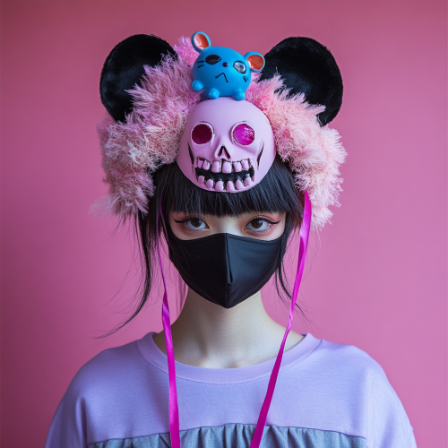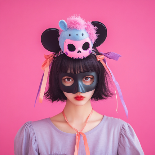 Realistic photo. A Japanese woman covers her head and face with a black mask. The mask has a pink skull printed on the forehead, pointed triangles on the left and right sides of the head like ears, and a red ribbon at the tip. On her forehead is a pink bushy ball with a blue mouse-faced toy and a purple ribbon dangling from it. She looks adorable with her pink cheeks and long false eyelashes. Her clothes are a pale purple T-shirt with fluttering sleeves and a large pale pink ribbon around her neck. Wearing a gray miniskirt. It has an arrow-shaped tail sticking out from its waist. Looking at the camera while posing on one knee.
