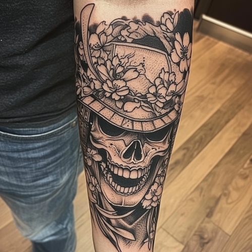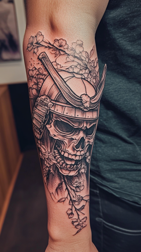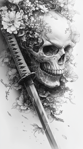 Tattoo design of the Skull hannya mask. Holding katana. Flowers in the background. Black and grey. Detailed online work. Photorealism. Powerful. Side profile. Full arm --style raw --s 750 --ar 9:16 --v 6.1