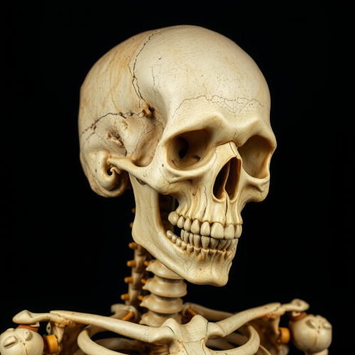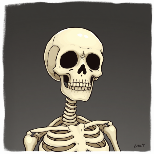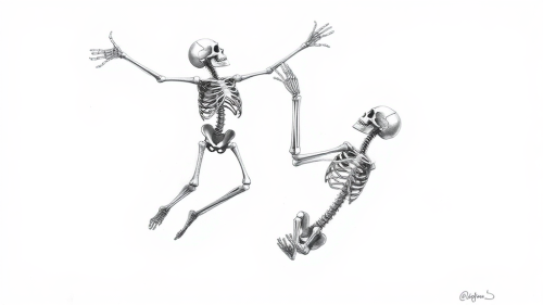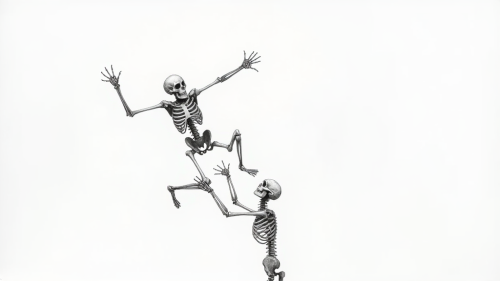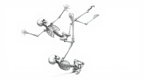 a high quality realistic image of a skeleton wearing a suit, jacket, shirt and tie and trousers. You can see the whole body of the skeleton, and he is standing at 45 degree angle with his hands clasped in front of his body