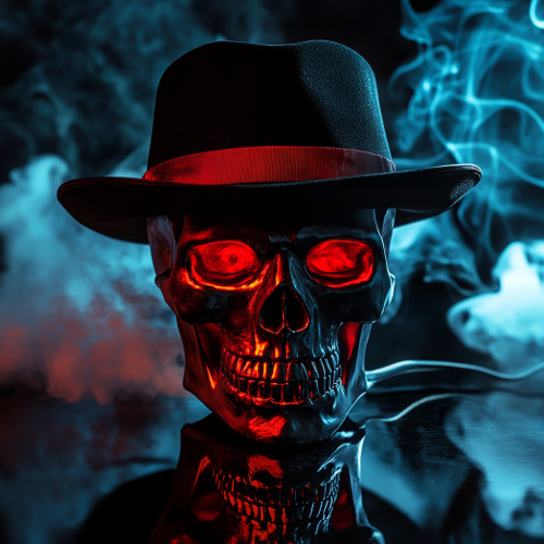 an elegant skull on a black shiny table wearing a black Fedora hat with a crimson red stripe, his red eyes looking directly at the viewer, elegant, smoke, cinematic --s 50 --v 6.1