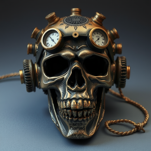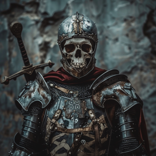 An armored medieval warrior with a skull head, an iron skeleton, a full body and a sad dark gray background An armored medieval warrior with a skull head, an iron skeleton, a full body and a sad dark gray background An armored medieval warrior with a skull head, an iron skeleton, a full body and a sad dark gray background --v 6.0 --seed 3112442786