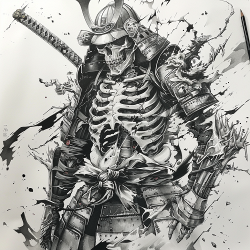 an evil skull samurai, with the skeleton rib cage and arm bones showing behind a broken samurai suit, semi realistic, chinese art style, dark, the samurai suit of armor also has cool patterns, the skull samurai is holding a sword with one hand, perspective is at a slightly higher angle looking down at the skull samurai