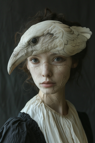 a korean woman wearing a large white bird skull mask, in the style of pop inspo, neil gaiman, Modern clothing in muted colors, dark beige and black, irving penn, animal figurines, tenebrism-inspired, avian-themed, Flat black background without decoration --ar 2:3 --style raw --stylize 750 --v 6.0