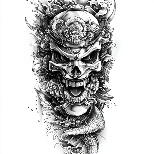 Tattoo design for skull samurai hannya mask, highly detailed line work style on arm sleeve, photorealism, unreal engine 5 render, cinematic, very detailed, 4k, black and white, white background --v 6.1