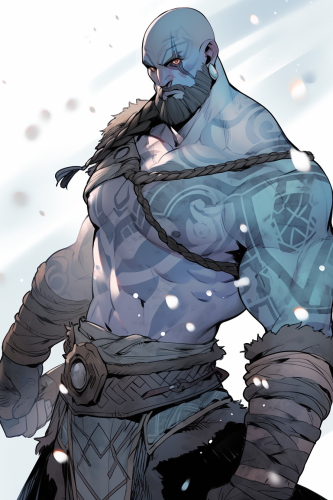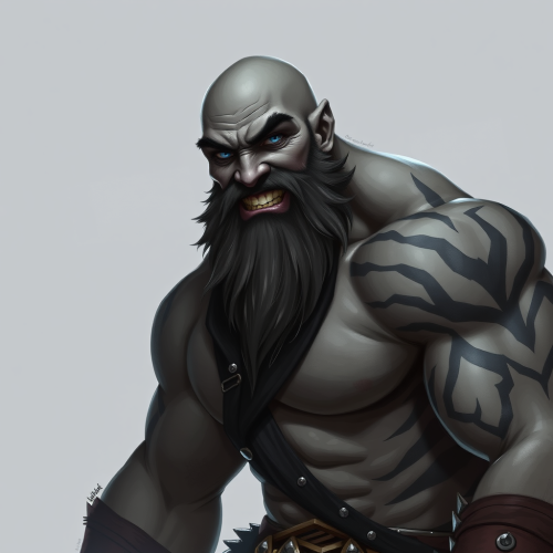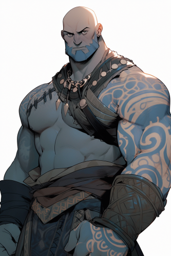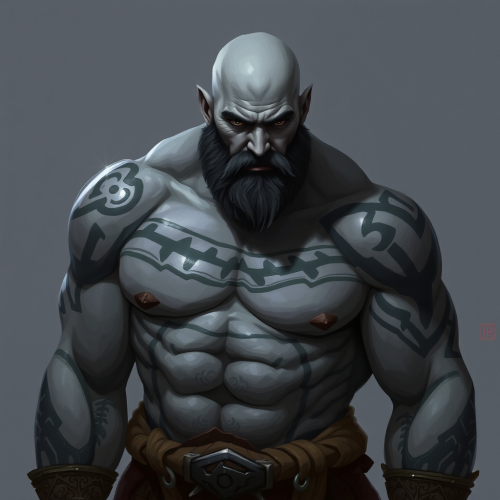 Goliath, gray ashen skin, muscular, barbarian, black tattoos, no hair, bald, hairless, no beard, clean shaven, bright blue eyes, happy expression, very muscular, dungeons and dragons character, fantasy concept art, nordic, viking inspired, critical role, legend of vox machina --niji 5 --ar 2:3