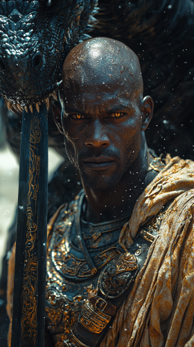 1970s illustrated dark fantasy , ultra realistic, low angle of bald black male barbarian looking up at the bottom, bronze armor, swinging an ethereal black glowing sword at an attacking black space dragon at the top in the white sands vale, bright blue day sky with Saturn rings clear facial features, Cinematic, 35mm lens, accent lighting, global illumination --style raw --v 6.1 --ar 9:16 --q 2 --s 750