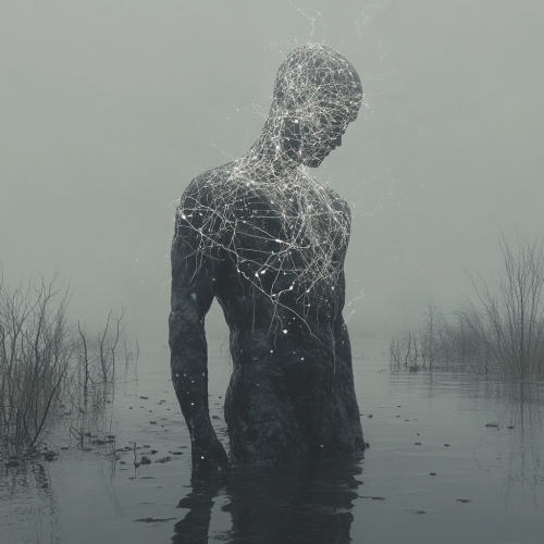 bald skinny man standing straight and slightly smiling, network of technological energy flow can be seen through his skin, flows out through top of his head and expands outward and upward, standing in the middle of a gray foggy and swampy forest, subject is seen from a medium distance