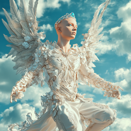 realistic full body image of a skinny male Angel that’s bald, has blue eyes, an Opal crown, and he’s wearing fantasy white angel clothes with beautiful details. The background is the sky with clouds. He is flying