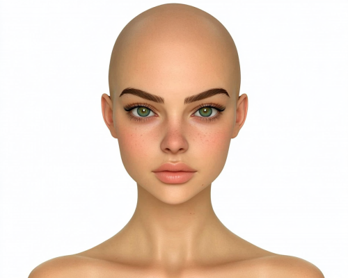 Front view of a beautiful European woman with a bald head, white background, blue eyes, symmetrical face, photorealistic, zbrush style, 3D render, highly detailed. --ar 5:4 --v 6.1 --sref 1800744731 --p si3d2b2 --c 7