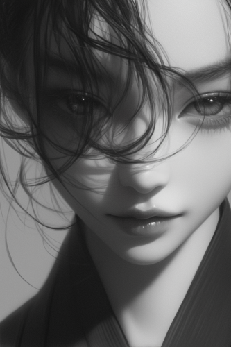 A portrait of a geisha , long hair and bright eyes, smiling gently at the camera, against a smooth smoke white background, with soft lighting, in a close-up shot. The photo is taken in a monochrome style, emphasizing the contrast between light and dark to highlight the facial features and emotions. --ar 2:3 --s 750 --niji 6