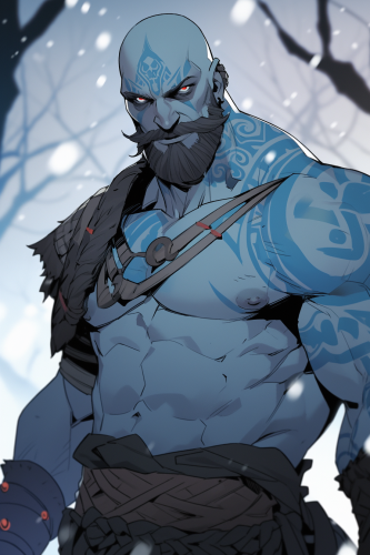 Goliath, gray ashen skin, muscular, barbarian, black tattoos, no hair, bald, hairless, bright blue eyes, happy expression, very muscular, dungeons and dragons character, fantasy concept art, nordic, viking inspired, critical role, legend of vox machina --niji 5 --ar 2:3