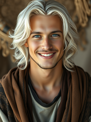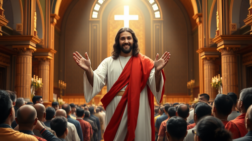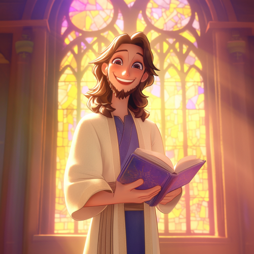 A 3D render of a young man with long brown hair, styled like Jesus Christ, smiling happily, holding a Bible. Wearing traditional biblical clothing, standing inside a beautifully detailed church, stained-glass windows casting soft light. Disney, Pixar, colorful, soft lighting, hd quality, joyful atmosphere, animated expression, intricate church details --niji 6