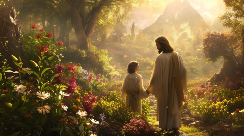 Jesus with a follower standing in a garden in Heaven --ar 16:9 --v 6.0