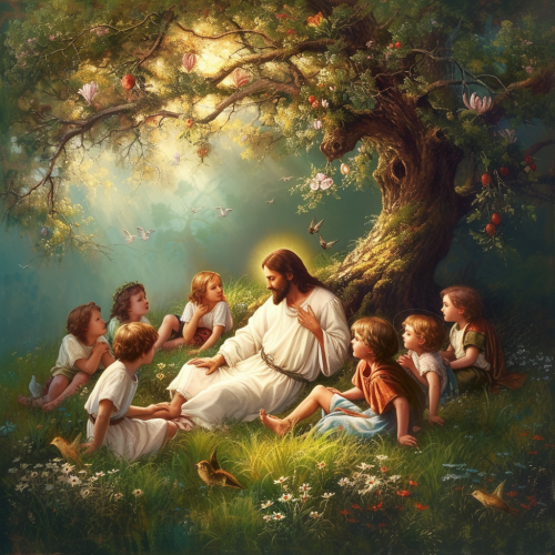 Jesus lay in peace on the grass under the tree with his young followers in the garden of heaven --v 6.0