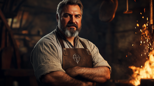 Medieval master blacksmith portrait, 42-year-old man with salt-and-pepper hair tied back, thick neat beard with gray streak, muscular broad shoulders, wearing leather apron with service symbol, standing proudly in his forge, warm lighting from forge fire, photorealistic, deep laugh lines around serious eyes, burn scars on calloused hands, fantasy RPG style, highly detailed, dramatic lighting, cinematic composition --ar 16:9