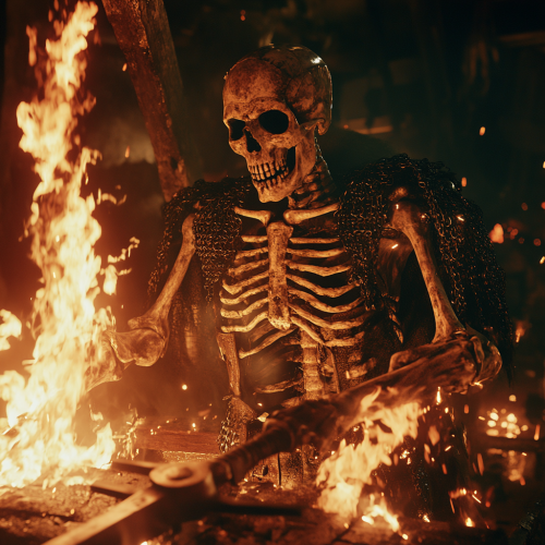 the location is hell, a dynamic and cooly posed full body scene of A badass Viking skeleton with Viking era clothing working as a blacksmith at a forge heating a mighty sword, with all the flames of hell licking around the room. 8k uhd, cinematic, dramatic