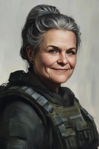 digital painting of an older woman soldier mercenary, tight braided bun hair, not very attractive but warm smile, neutral grey background, three-quarter portrait, Dungeons and Dragons --ar 2:3 --v 6.1