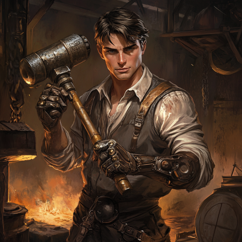 fantasy illustration of a blacksmith with clockwork arms holding a large hammer, he has short cropped brown hair and grey eyes, the background in a forge