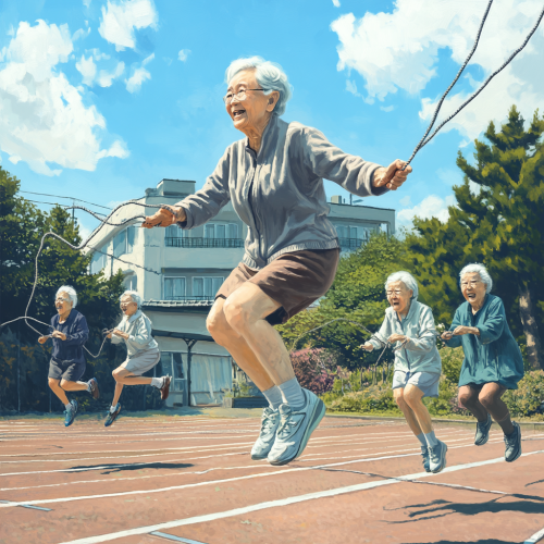 Draw a realistic, high-quality image of elderly Japanese women enjoying jumping rope on an outdoor track field. The women are wearing gym clothes and sportswear and are smiling and jumping happily. A school building can be seen in the background, and multiple grandmothers appear on the screen, depicting them all enjoying exercise together.