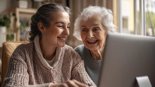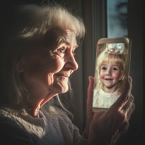 Create a photograph of a happy old blonde woman holding a smartphone, gazing intently at the screen. On the phone’s display, she sees a reflection of herself as a smile child, as if she’s using a Instagram filter. The filter should transform her current appearance into a younger version of herself, showing her with childhood features and attire. The setting should be contemporary, with natural lighting that highlights both the woman and the screen. The focus is on the emotional impact of seeing her past self through the digital lens --v 6.1
