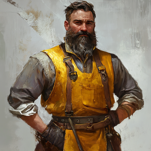 high fantasy style of clothing based on mining and blacksmithing gear meant for nobles and kings. Blacksmith king, Blacksmith emperor. Aprons. Decorated Miner, fancy fantasy miner