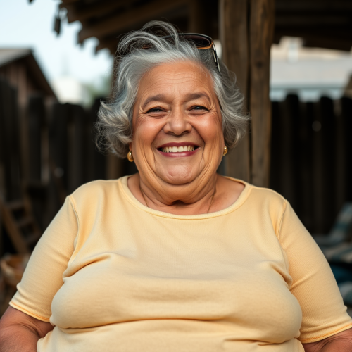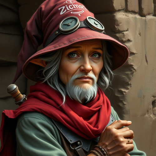 elderly female dwarf, red hair, smiling, green and yellow clothes, fantasy, realism