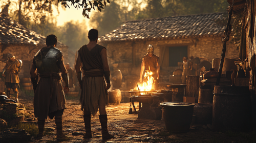 Two hoplites visiting a blacksmith's workshop to repair their armor, observing the blacksmith at work, the forge glowing, simple village life bustling around them. Hyper Realistic HD photos --v 6.1 --ar 16:9