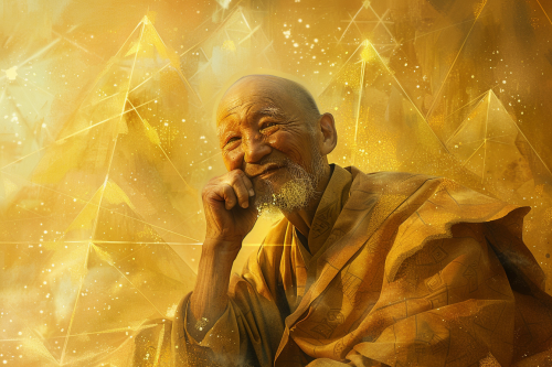 One male, balding elderly man, right eye with golden glow, golden aura, sitting posture with left hand across chin, smiling expression with right corner of mouth upturned, wearing ochre robes, multiple pyramids of golden light visible behind elderly man's back --ar 3:2