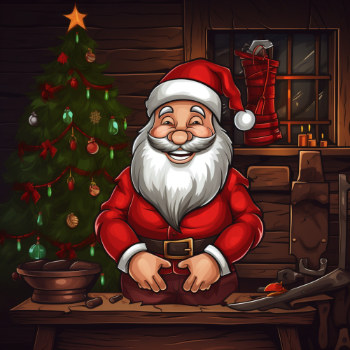 a cute christmas card illustration with a smiling santa claus inside a blacksmith shop sitting in front of a laptop with a christmas tree as a logo, behind him in the background is a christmas tree, an anvil and a data science line chart --no typo, writing, planets, outer space