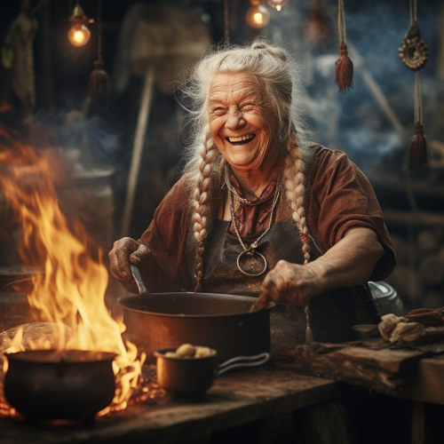 realistic elderly smiling viking woman cooking a stew