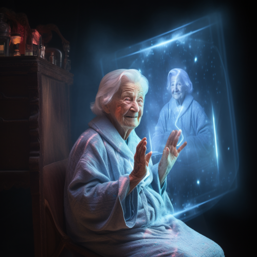photograph of a hologram of an elderly grandmother. The hologram smiling and projecting from a tombstone. Natural lighting. Candid image.