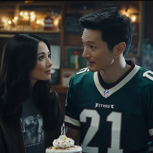 in a cinematic scene, a handsome asian man bids farewell to Alice, from Alice in wonderland, who is standing opposite him. Alice is wearing a jersey of NFL team Philadelphia eagles, and bids him farewell too. That is because he needs to sleep. There is also a birthday cake in the scene because she had a great birthday with friends and loved ones. goodbye!