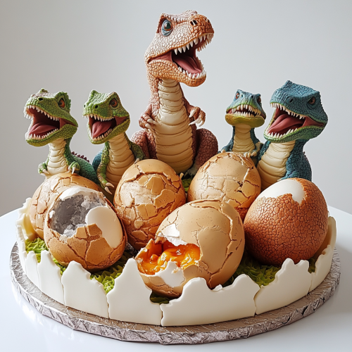 Decoration on a birthday cake. 1 dinosaur is born from an egg. Dinosaurs emerge their heads from broken eggs. Around it, seven eggs are waiting to be born.