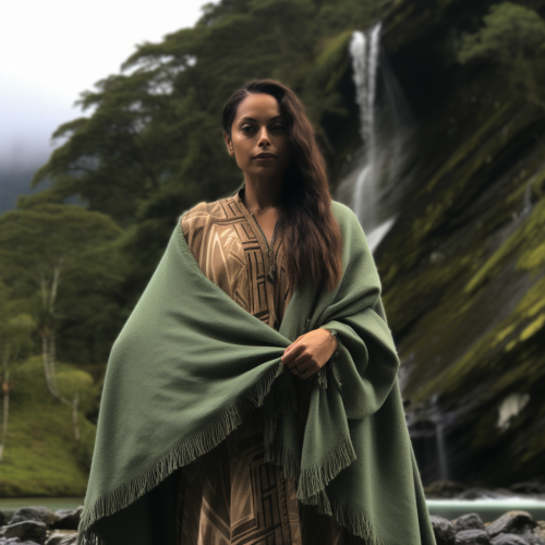 a fair skinned māori woman wearing a greenstone neckland with a plain brown blanket with only small triangles on the hem drapped over her shoulder in front of a water fall