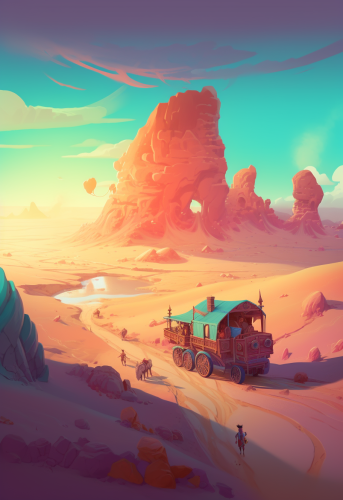 concept fairytale landscape art of desert with with a distant view of a traveling fantasy caravane with its colorful wagons and tiny figures of travelers --ar 64:93 --v 5.0