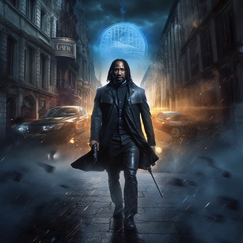a movie poster with john wick as a thief who travels through time. Put idris elba on the side behind him. In the background show different cities in time