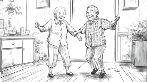 a hand-drawn sketch-style storyboard of an elderly Japanese couple in their home dancing slowly. The woman is wearing a small sensor on her arm. They both smile --ar 16:9
