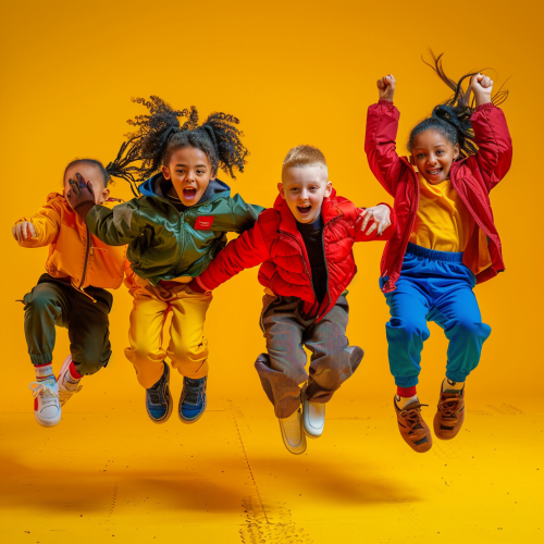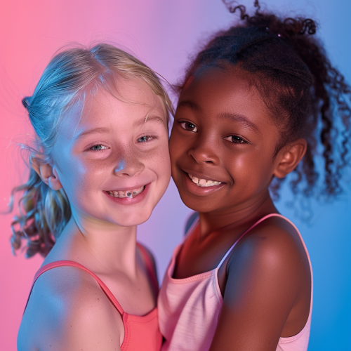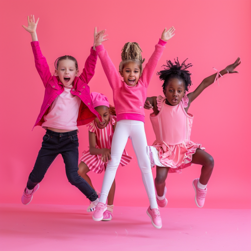fun dance photoshoot with a 4 kids aged 8, happy, hd quality, mixed nationalities, in the dance studio, vibrant pink