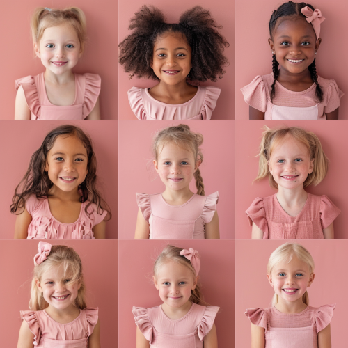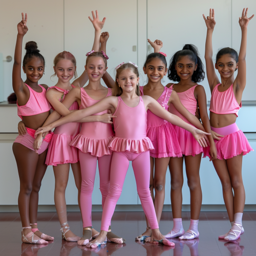 dance students in the dance studio, doing dance photoshoot, happy faces, children aged 8, different nationalities, hd quality, in light pink dance outfits