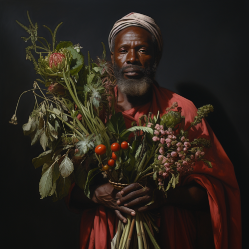 foto hiper realista, hombre de cuerpo completo, orichas africanos, eleggua, ceremonia religiosa yoruba, botanica, plantas medicinales, remedios religiosos