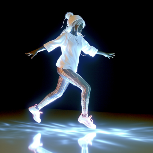hip hop dance of holographic gorgeous white woman ghost, high details, photo realistic, natural light, long shot side view, full body, high motion --s 750 --no dress --c 10