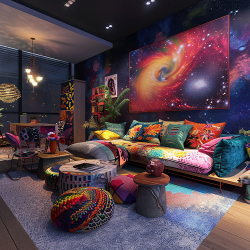 Hyper realistic living room which gives vibe of couple living here who are into trekking, bollywood dancing and we are interested in next generation technology and are eager to go to mars and i believe & manifest in cosmic energies and connections, also with nature. This is living room with dimension as 10 * 4 meters. It is a brightly lit, positive, cozy space.