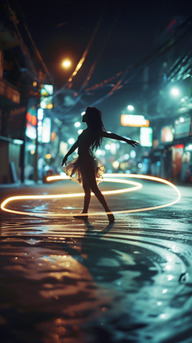A portrait of a dancer in the middle of a spin on a Jakarta street at night, captured with slow shutter speed to create a whirl of motion, lights forming a circular trail around them, subtle greenish tint on shadows, muted colors, film grain --v 6.0 --ar 9:16 --style raw