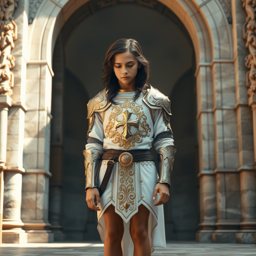A medieval stained glass window depicting a knight holding a shield, with intricate designs in pastel colors like light lavender, soft gold, and pale blue. The transparent glass sections create realistic light effects, giving the knight’s armor and shield a glowing appearance. The design combines medieval themes of valor with a fresh, modern pastel color palette. --ar 9:16 --v 5.0