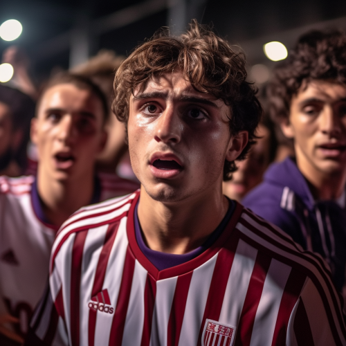 Dutch football player, 20 years old, taken with a Canon EOS R5, 300mm lens, f2.8, evening match under stadium lights, wearing purple and white striped Fiorentina jersey, running down the right flank during an intense match, determined expression, short hair, muscular build, crowd cheering in the background, action shot, dynamic posture, sharp focus on the player, full stadium as background --v 5.0 --s 800