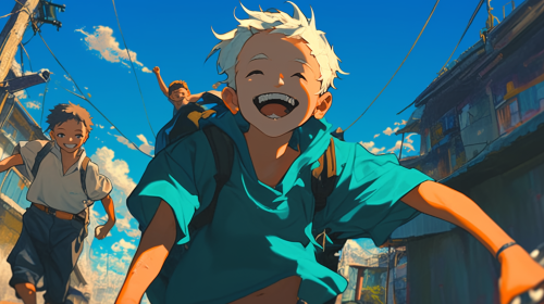 a close-up of three happy 12-year-old caucasian children walking the streets of Lagos Nigeria during the day, high-definition, anime-style, --ar 16:9 --niji 6